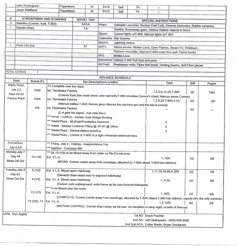 T4 deleted scene Scene description The original third act of Terminator Salvation was different. Someone who claims to be an insider, has given me the list and I have expanded the information that I got via discussions. Anyway, the notes start with --> 17) Huge conversation before Connor goes to skynet. In the theatrical release you can tell something was deleted because there is an awkward cut before you see John and Kate start to kiss. This was the day Bale had his rant. There is an important conversation Kate has with John while he is preparing. They talk about how much they love each other and how important they are to one another and about their unborn child. Would have been a great little moment. --> Extended goodbye John/Kate (Kate's pregnancy / "Win or lose, this war ends tonight") 18) After Marcus climbs the wall of Skynet and gets accepted by the gun turret, he hides in an old church. A skynet bulldozer comes and knocks it down while running over skulls. --> Marcus sneaking into Skynet 19) Connor rides the moto-terminator across the bridge. The bridge is out and he uses a grappling hook to get across the bridge as the moto-terminator falls. 20) Marcus outside Skynet. Sees a bunch of T-600s. Looks up at a building, sees lights on the 5th floor. Sneaks inside. --> Marcus sneaking into Skynet 21) Marcus is on the 5th floor. Spots the hybrid male at the computer console. He is busy, typing fast. He spots Marcus and responds to him warmly. Marcus looks at him and throws him out the window. The hybrid neck is severed. Marcus then goes to the console. --> Hybrid Male (Greg Plitt) --> Hybrid Male: "Hello Marcus." 22) MAJOR CHANGE- When Marcus is done at the console we hear Serena say Hello to Marcus. Serena is a Hybrid and in person. She has a pet T-800 that places Marcus in the chair. Their conversation is not all that different from the one you hear in the movie. Lots more though. She kisses him. He gets out of the chair and they continue to talk. Cut to: Different conversation in the submarine with Ashdown. A harvester goes into the water and crushes the ship. We see Ashdown die. Marcus gets mad and goes to kill her and gets knocked away by a robotic arm and thrown by the T-800. He rips out Serenas micro-chip at the back of her neck. The robotic arm then takes her for human and rips her apart. --> Hybrid Serena --> The scene with the harvester was partially shot. They shot the interiors of the sub with the actors, but never finished the CGI in post because they already knew they were changing it. 23) Connor sneaks into skynet. He sees everyone being tested on. Spots a T-600 and hides. The T-600 looks into an elevator shaft and Connor rigs the Elevator to blow. The elevator comes down and cuts the T-600 in two. --> Hybrids at Skynet Central --> Other T-600 inside Skynet Central --> The Hybrids control Skynet, which I believe is one of the reasons they ultimately cut that story. When all was said and done I think they though it was foolish to take the story in that direction. I think thats the problem with having so many re-writes so quickly and with such a deadline. No one has time to think things through. 24) After Kyle looks for Star and find Connor they blow up the wall. Before they go to the terminator factory the hole in the wall actually leads to prisoner holding pens. Connor releases the prisoners. They get chased by the T-800, blow up another wall, see a shaft, then jump down. --> Kyle, Star, and John blast their way through the wall and free the rest of the prisoners. The T-800 picks up the gun and follows them. There is a brief scene with the T-800 by the holding pens before Kyle, Star, and John jump down a shaft. This accounts for the continuity error when they jump down the hole in the TR. This is from the final Shooting Script, however was cut for the final cut. Its not part of the reshoots, but was cut for timing purposes most likely. 25) Kate, Blair and Barnes decide to go after John. Kate grabs a shotgun. They land the helicopter as Kate shoots a T-600. they see all the human prisoners escape. They get Kyle, Star and Virginia and ask where John is. Barnes and two other soldiers go after John. They see Marcus fighting another T-800 after Marcus had been carrying John out. Barnes hands him a machine gun and Marcus kills the T-800. --> A call sheet confirms this scene. Notice the line: 154A - Int. Terminator Factory (Marcus battles T-800; Barnes gives Marcus the machine gun and the tide is turned) 26) (Alt) We see barnes and Marcus carrying out Connor. They wonder how to get all the prisoners out of there. They tell Barnes to get out and hotwire the Transporter. Blair has a problem with the rotor from the helicopter. Marcus fixes it. Barnes goes to the transporter. Virginia sacrifices herself. --> Virginia tries to save someone that is about to be attacked by a T-600. She originally stays behind to detonate the bomb, but they figured Virginia wasn't important enough to be the one who does that. She gets killed by the T-600 though either way. --> T-600 snaps Virginia's neck. 27) As Barnes is getting everyone into the Transporter a Harvester comes. Marcus spots it and uses the Helicopter Gun to shoot the Harvester while in Terminator mode. --> They definitely shot the prisoners escaping. Sometimes it was hard to tell because of all the VFX work that had to be done. If they did shoot it then its just a few plate shots....background and whatnot. I don't think they ever even bothered finishing the VFX...but i'm not 100%. I can ask someone. 28) Kyle buries Marcus while wearing Connors jacket. He reaches into the pocket and takes out the photo of Sarah Connor. Photo morphs back into John. Push away to Soldiers getting into Helicopters. They fly away as the camera heads back down over Marcus's grave. Fade. --> Kyle burying Marcus and finding Sarah's Polaroid Why did they take out the T-700's? --> They ended up thinking it was going to be too confusing. With the hybrid plot taken
